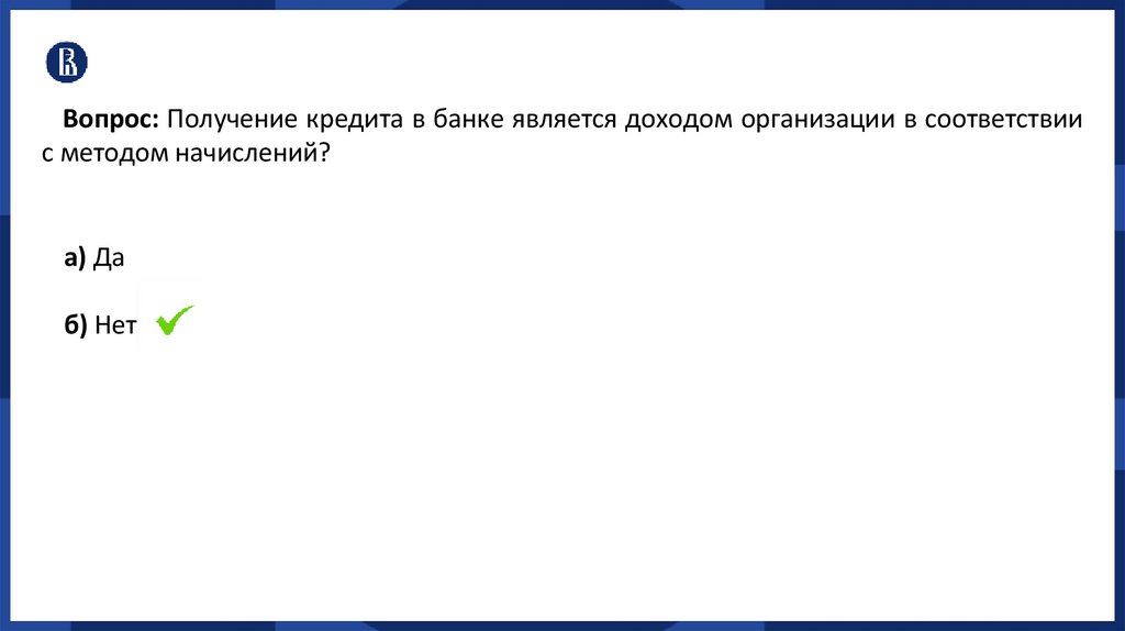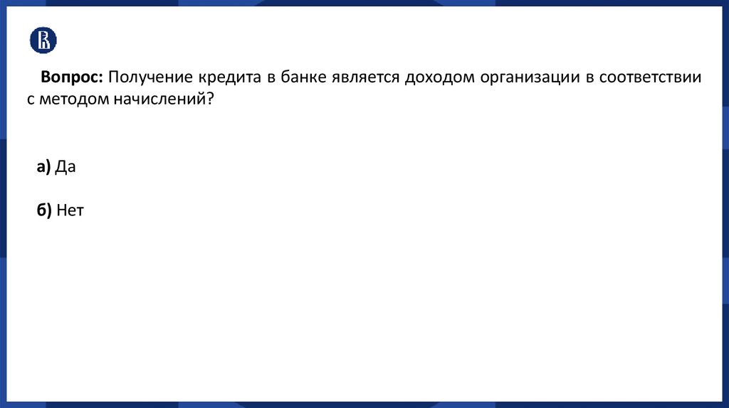 59Вопрос: Получение кредита в банке является доходом организации в соответствии