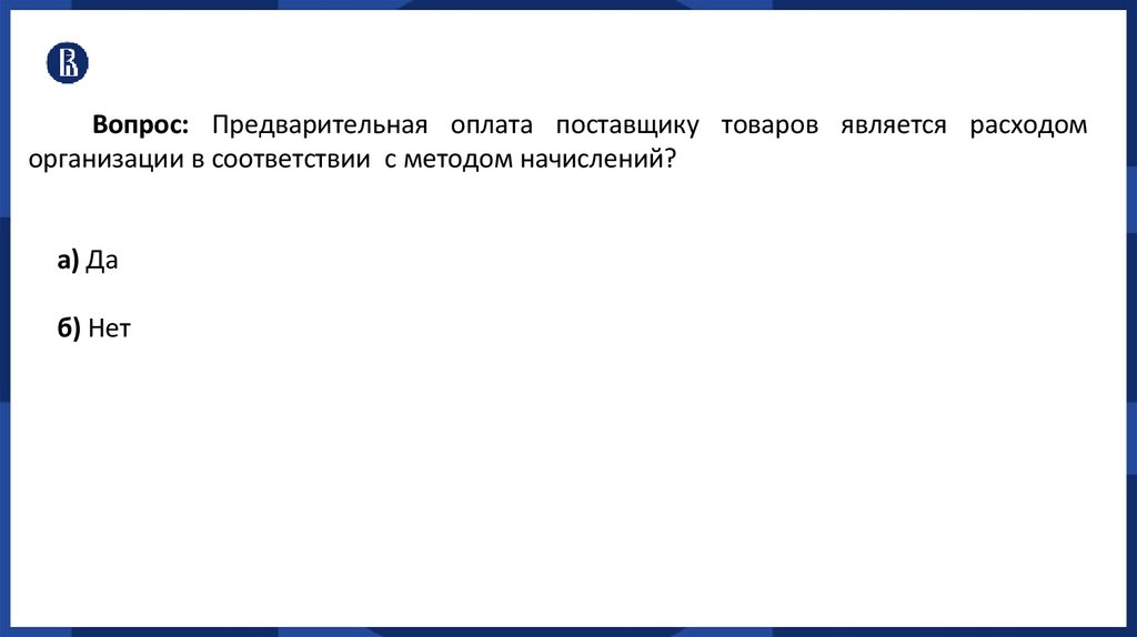 61Вопрос: Предварительная оплата поставщику товаров является расходом