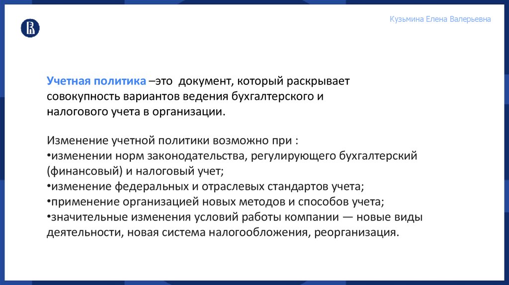 Кузьмина Елена ВалерьевнаУчетная политика –это документ, который раскрывает