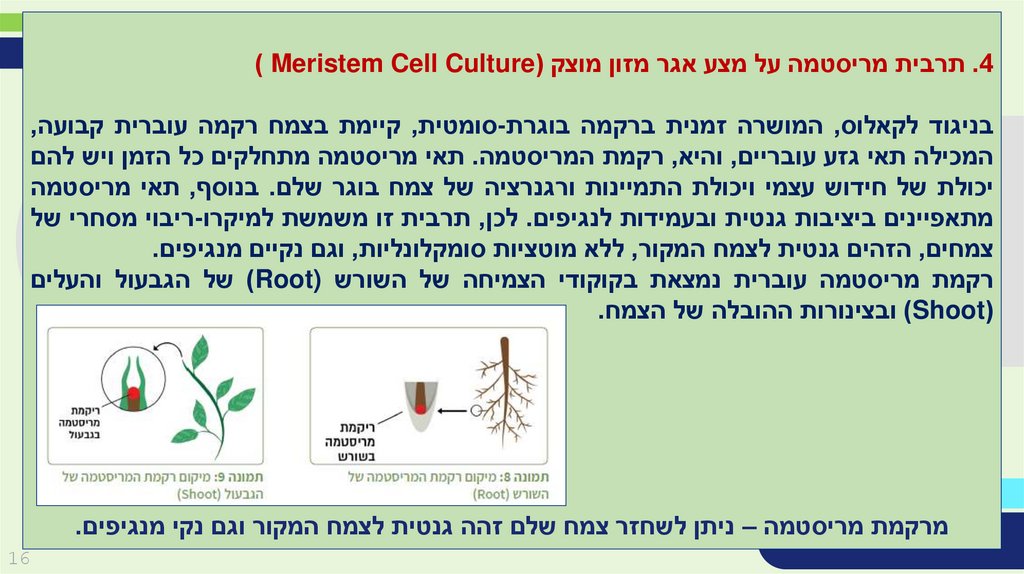 .4תרבית מריסטמה על מצע אגר מזון מוצק () Meristem Cell Cultureבניגוד לקאלוס ,המושרה זמנית ברקמה בוגרת-סומטית ,קיימת בצמח רקמה עוברית קבועה,