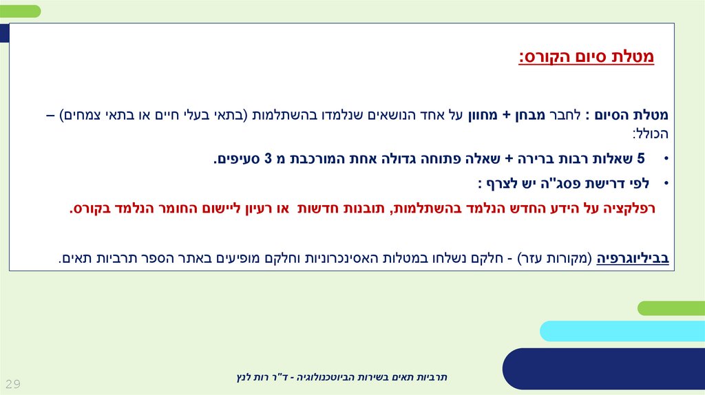 מטלת סיום הקורס:מטלת הסיום :לחבר מבחן +מחוון על אחד הנושאים שנלמדו בהשתלמות (בתאי בעלי חיים או בתאי צמחים) –