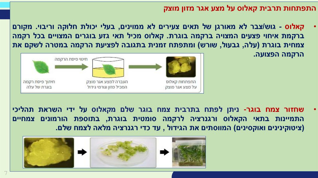 שחזור צמח בוגר -ניתן לפתח בתרבית צמח בוגר שלם מקאלוס על ידי השראת תהליכי