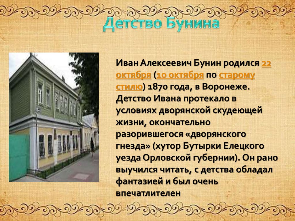 Иван Алексеевич Бунин родился 22октября (10 октября по старому