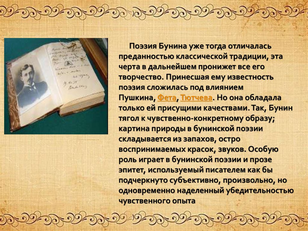 Поэзия Бунина уже тогда отличаласьпреданностью классической традиции, эта
