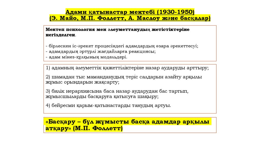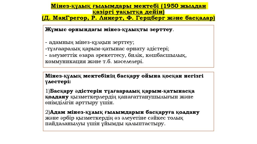 (Д. МакГрегор, Р. Ликерт, Ф. Герцберг және басқалар)