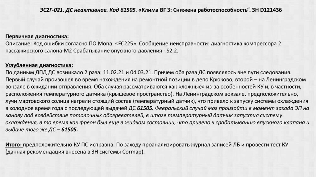 ЭС2Г-021. ДС неактивное. Код 61505. «Клима ВГ 3: Снижена работоспособность“. ЗН D121436Первичная диагностика: