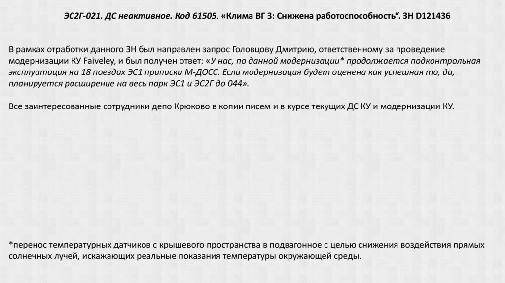 ЭС2Г-021. ДС неактивное. Код 61505. «Клима ВГ 3: Снижена работоспособность“. ЗН D121436В рамках отработки данного ЗН был направлен запрос Головцову Дмитрию, ответственному за проведение