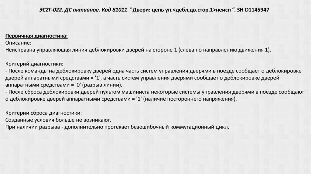 ЭС2Г-022. ДС активное. Код 81011. "Двери: цепь уп.<дебл.дв.стор.1>неисп “. ЗН D1145947Первичная диагностика: