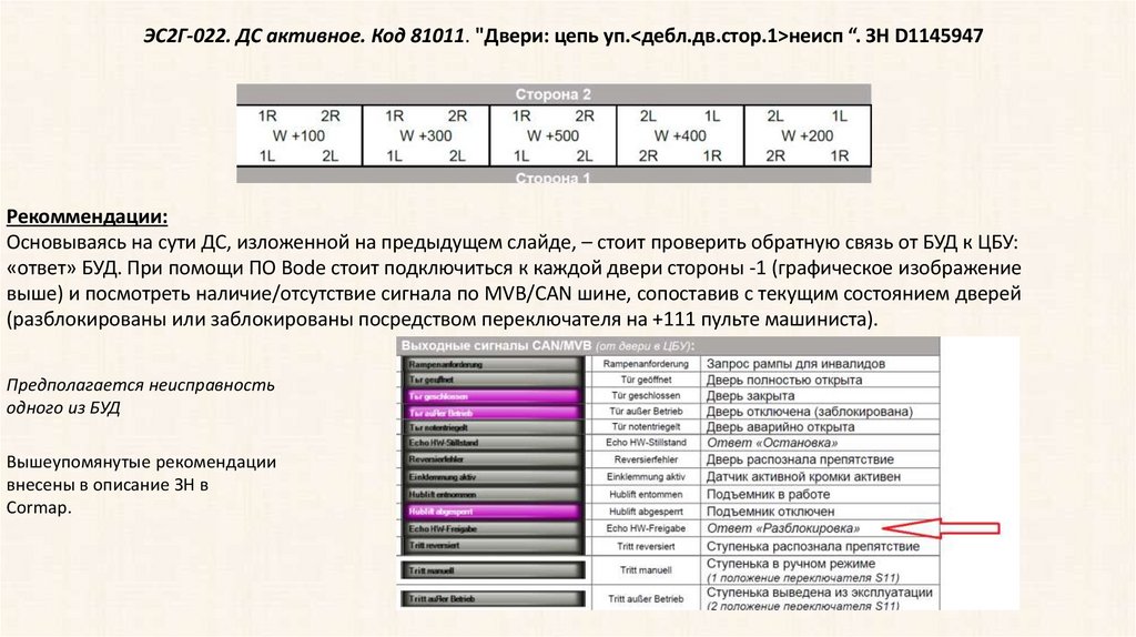 ЭС2Г-022. ДС активное. Код 81011. "Двери: цепь уп.<дебл.дв.стор.1>неисп “. ЗН D1145947Рекоммендации: