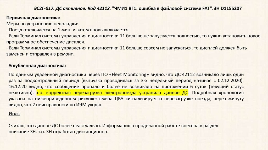 ЭС2Г-017. ДС активное. Код 42112. "ЧМИ1 ВГ1: ошибка в файловой системе FAT“. ЗН D1155207Первичная диагностика: