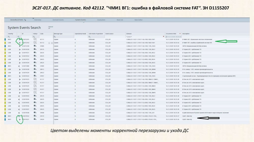 ЭС2Г-017. ДС активное. Код 42112. "ЧМИ1 ВГ1: ошибка в файловой системе FAT“. ЗН D1155207Цветом выделены моменты корректной перезагрузки и ухода ДС