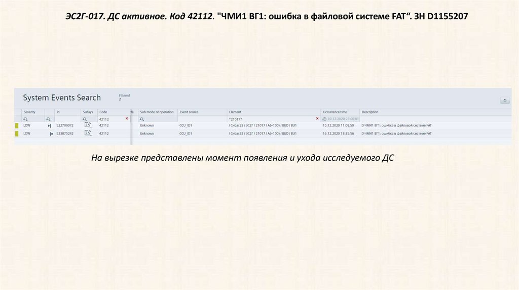 ЭС2Г-017. ДС активное. Код 42112. "ЧМИ1 ВГ1: ошибка в файловой системе FAT“. ЗН D1155207На вырезке представлены момент появления и ухода исследуемого ДС
