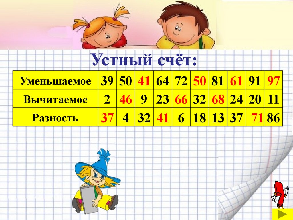 Устный счёт:Уменьшаемое 39 50 41 64 72 50 81 61 91 97
