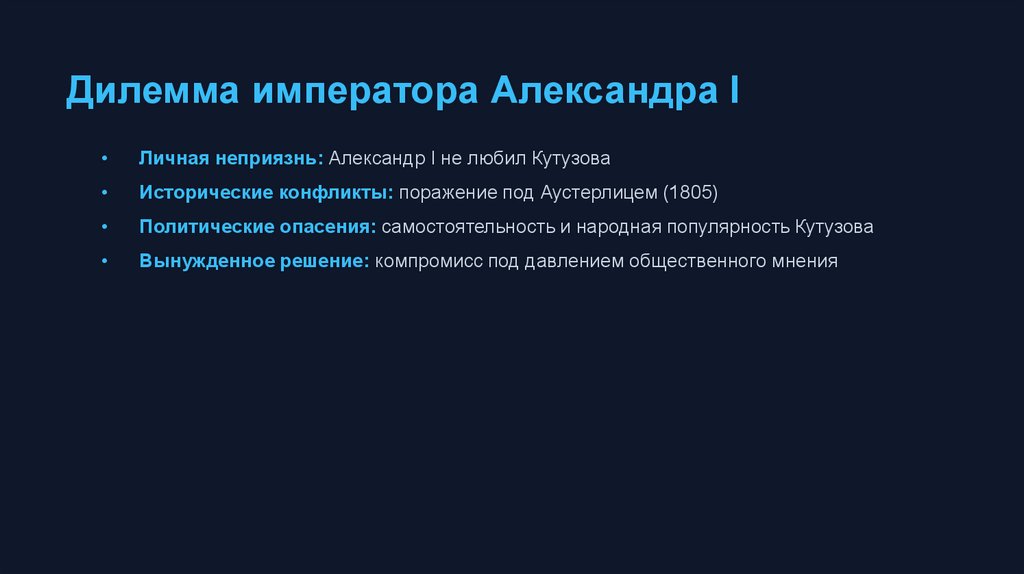 Дилемма императора Александра IЛичная неприязнь: Александр I не любил Кутузова