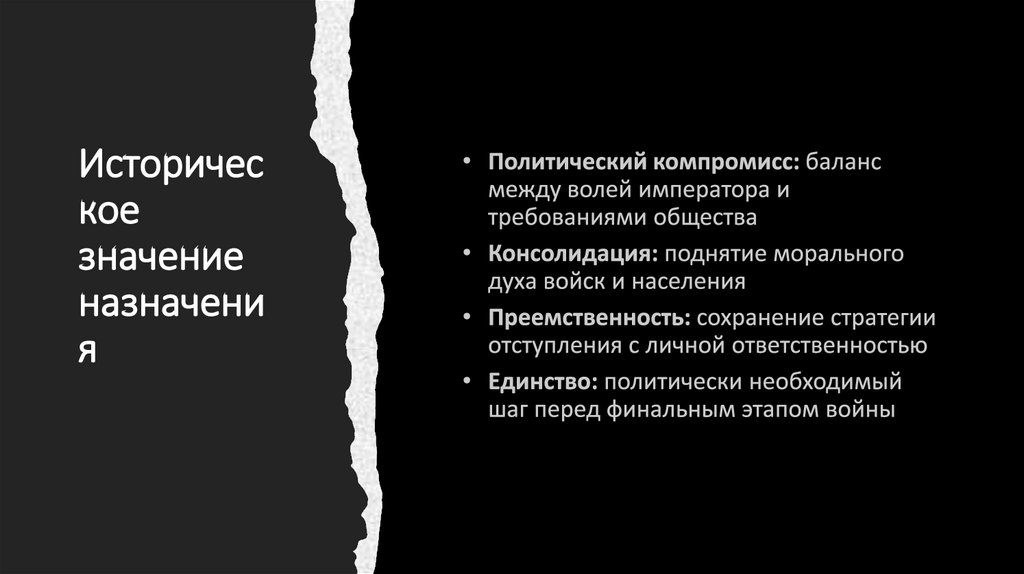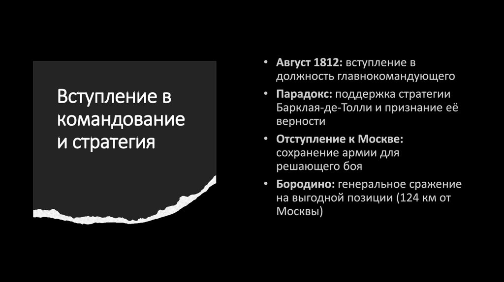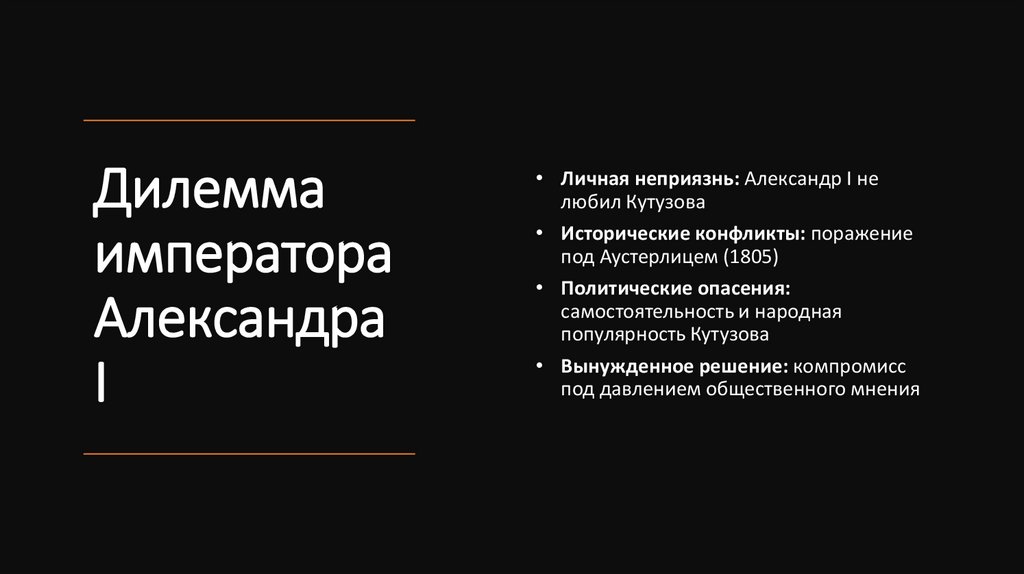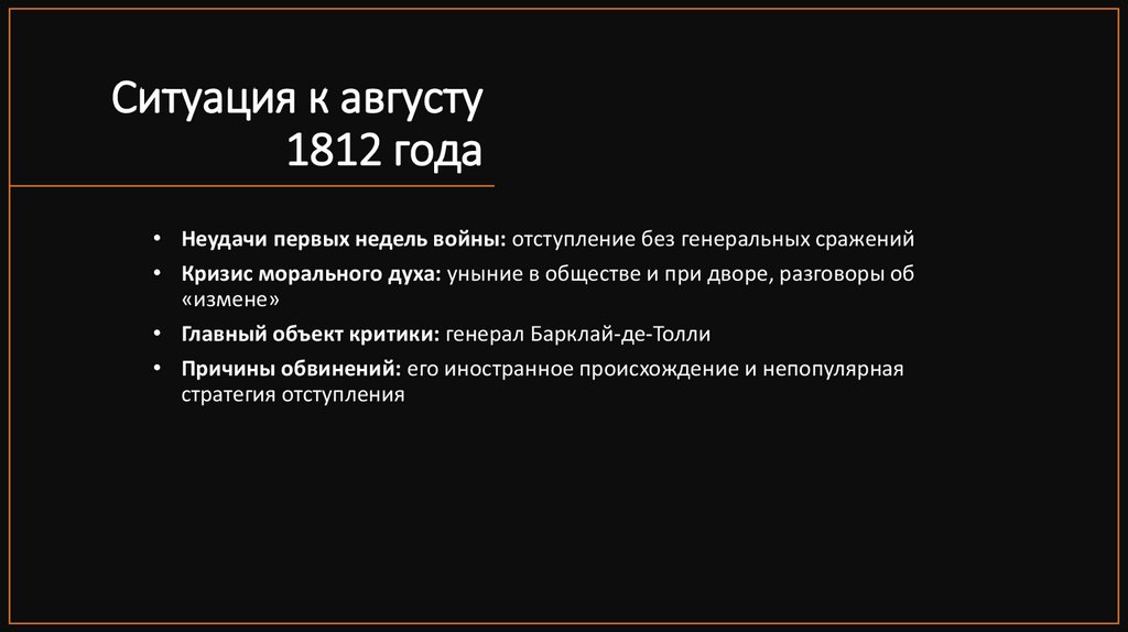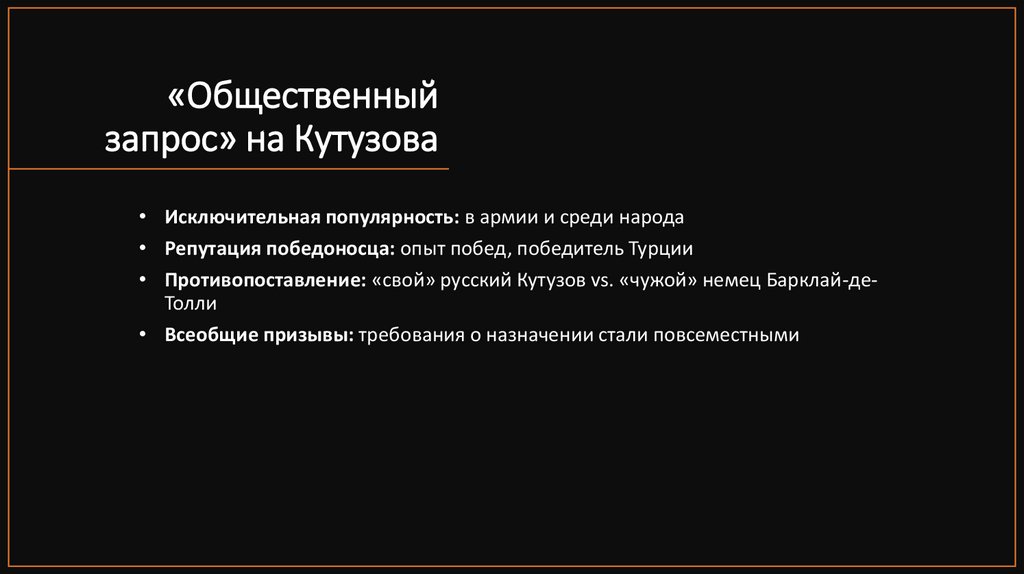 • Противопоставление: «свой» русский Кутузов vs. «чужой» немец Барклай-деТолли