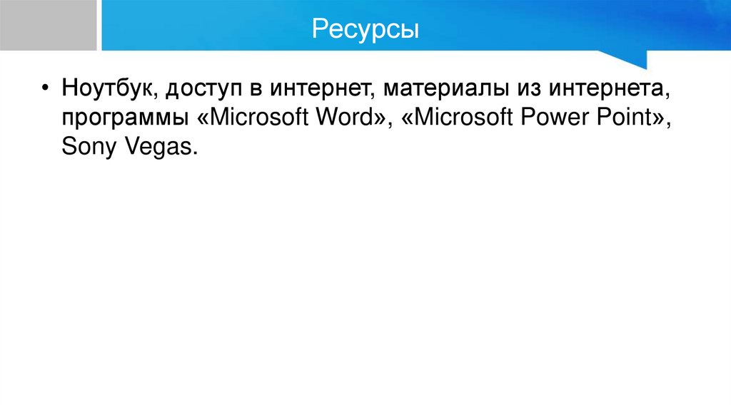 Ресурсы• Ноутбук, доступ в интернет, материалы из интернета,