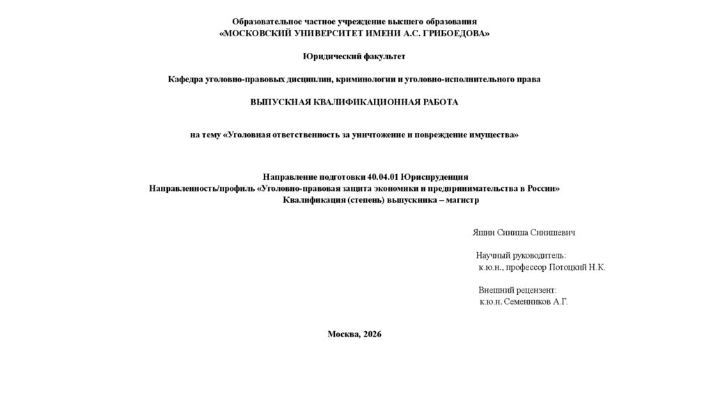 1. Образовательное частное учреждение высшего образования «МОСКОВСКИЙ УНИВЕРСИТЕТ ИМЕНИ А.С. ГРИБОЕДОВА» Юридический факультет