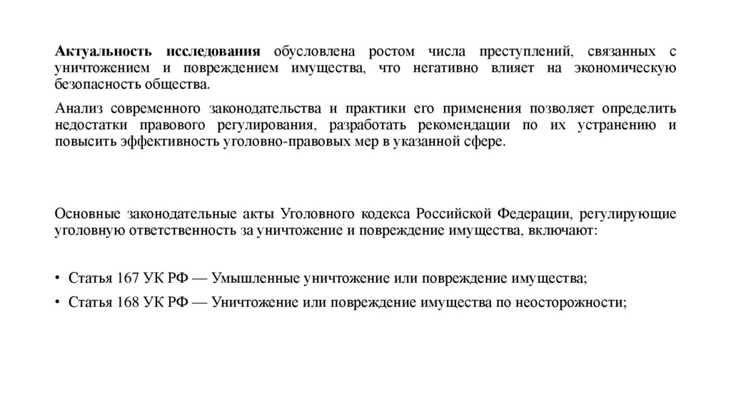 Актуальность исследования обусловлена ростом числа преступлений, связанных суничтожением и повреждением имущества, что негативно влияет на экономическую