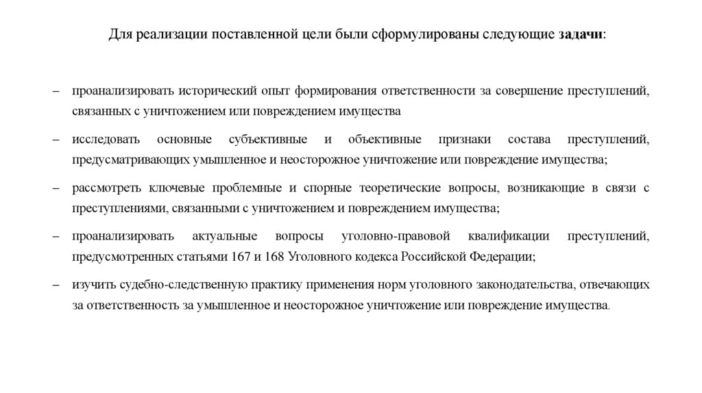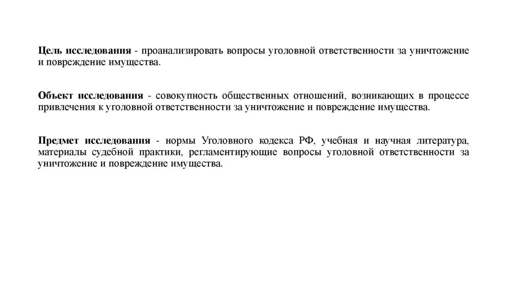 Цель исследования - проанализировать вопросы уголовной ответственности за уничтожениеи повреждение имущества.
