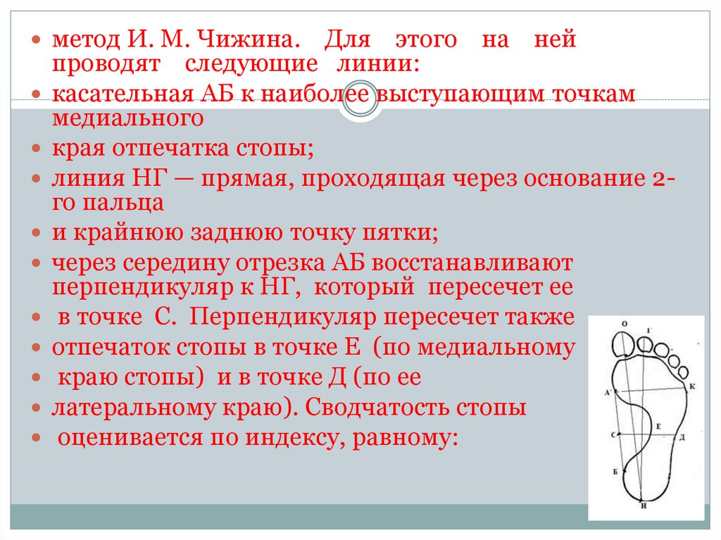 Метод Штритера состоит в том, что к наиболее выступающимточкам медиального края отпечатка стопы проводится