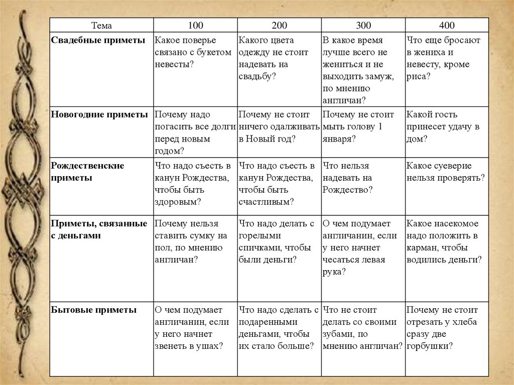 А теперь давайте проведём квест-викторину «Приметы и суеверия вВеликобритании и России»
