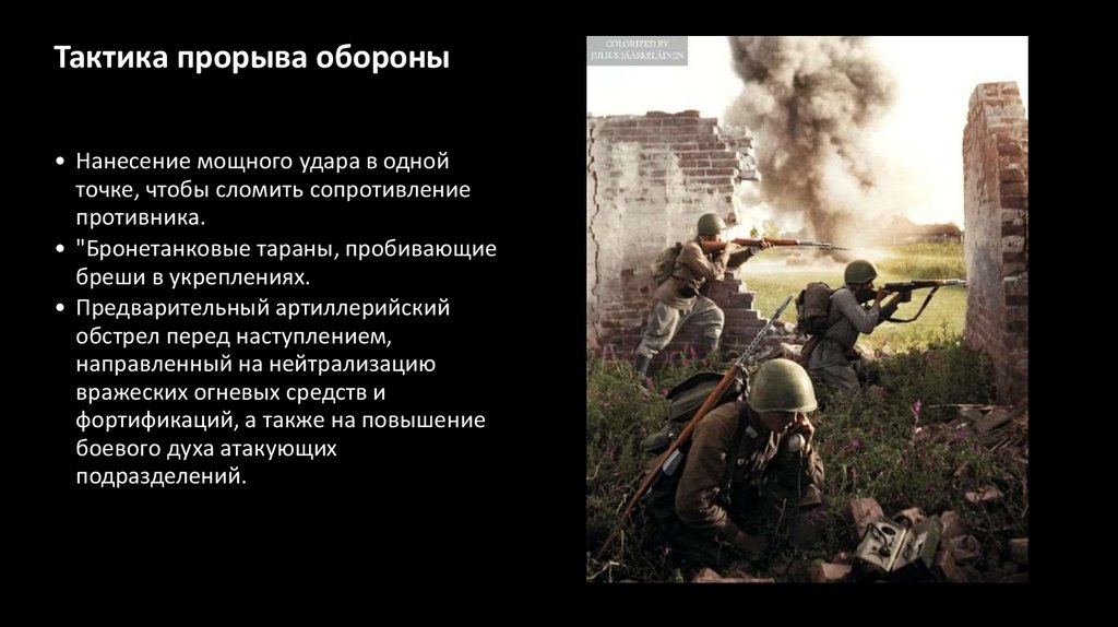 Тактика прорыва обороны• Нанесение мощного удара в одной