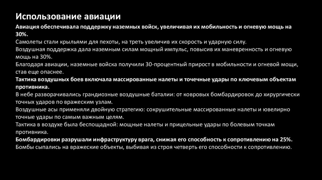 Использование авиацииАвиация обеспечивала поддержку наземных войск, увеличивая их мобильность и огневую мощь на