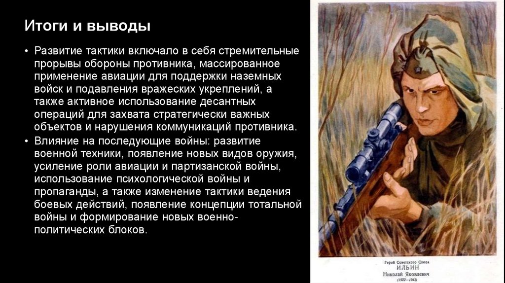 Итоги и выводы• Развитие тактики включало в себя стремительные