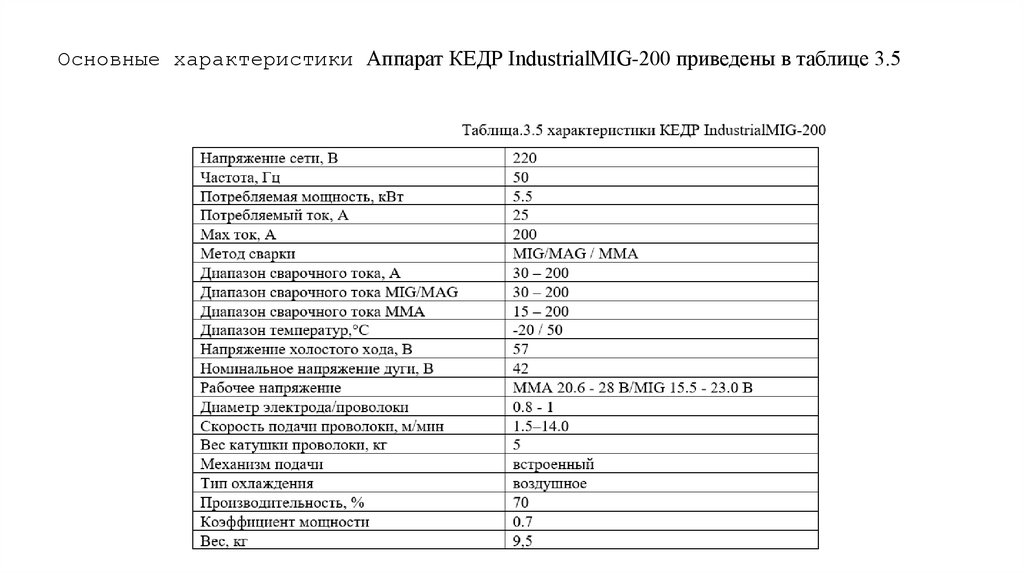 Основные характеристики Аппарат КЕДР IndustrialMIG-200 приведены в таблице 3.524. 4. БЕЗОПАСНОСТЬ ПРИ ПРОВЕДЕНИИ СВАРОЧНЫХ РАБОТ