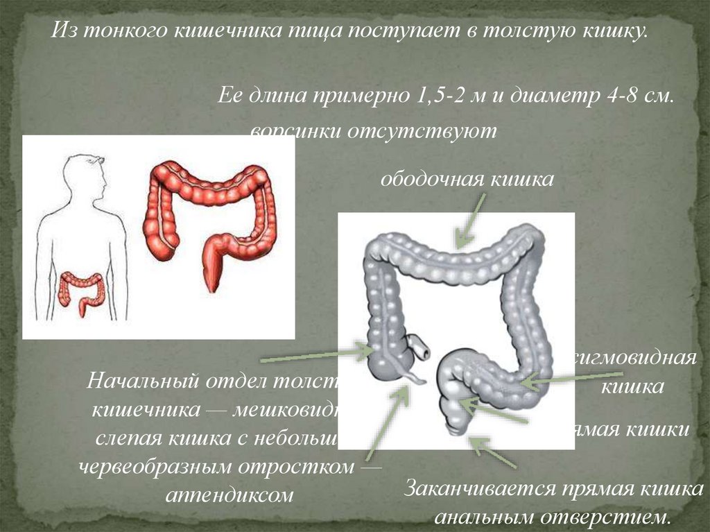 Из тонкого кишечника пища поступает в толстую кишку.Ее длина примерно 1,5-2 м и диаметр 4-8 см.