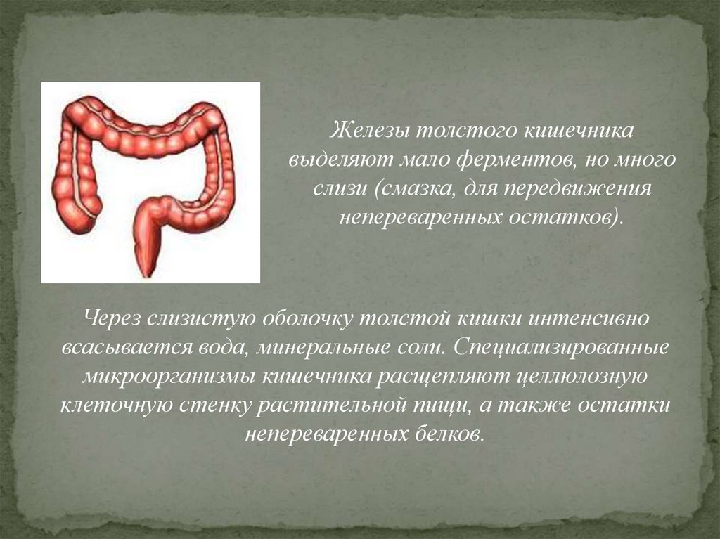 Железы толстого кишечникавыделяют мало ферментов, но много