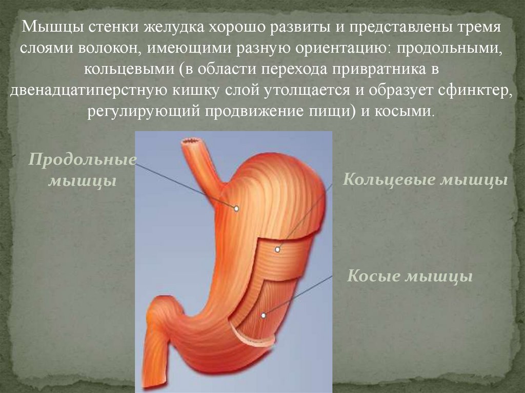 Мышцы стенки желудка хорошо развиты и представлены тремяслоями волокон, имеющими разную ориентацию: продольными,