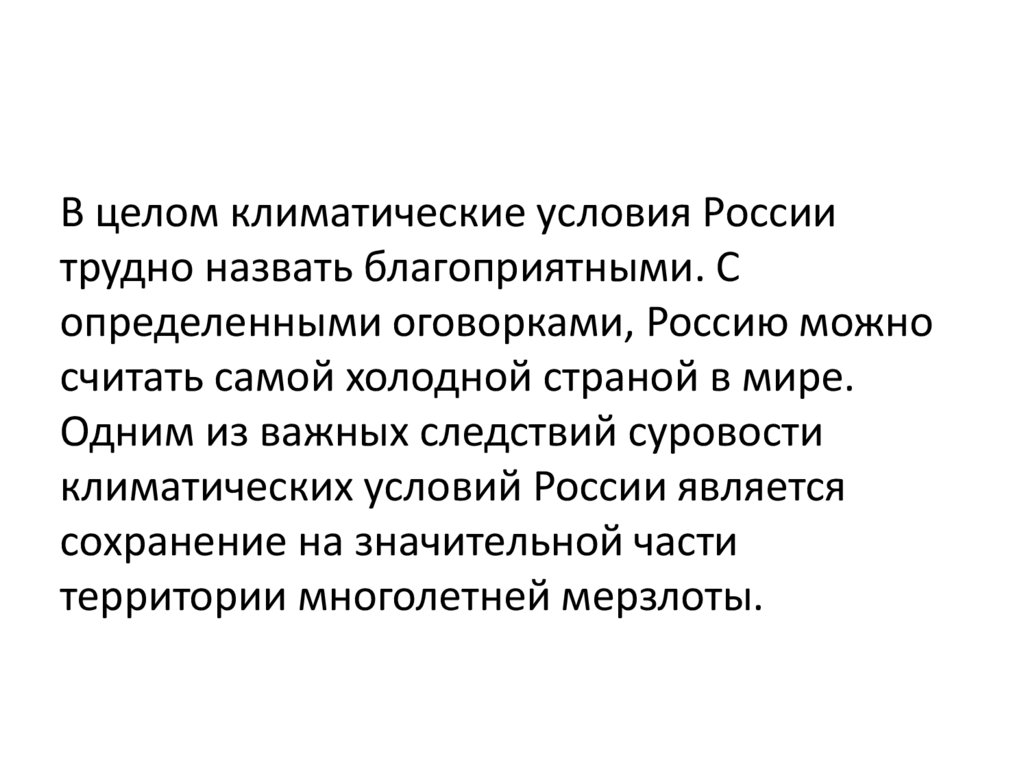 В целом климатические условия Россиитрудно назвать благоприятными. С