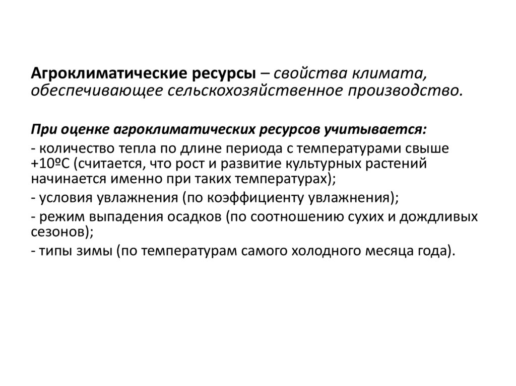 При оценке агроклиматических ресурсов учитывается: