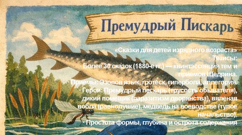 · Приемы: Эзопов язык, гротеск, гипербола, аллегория.