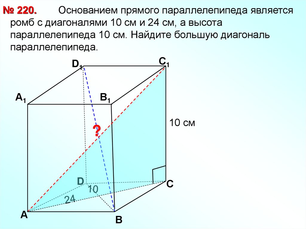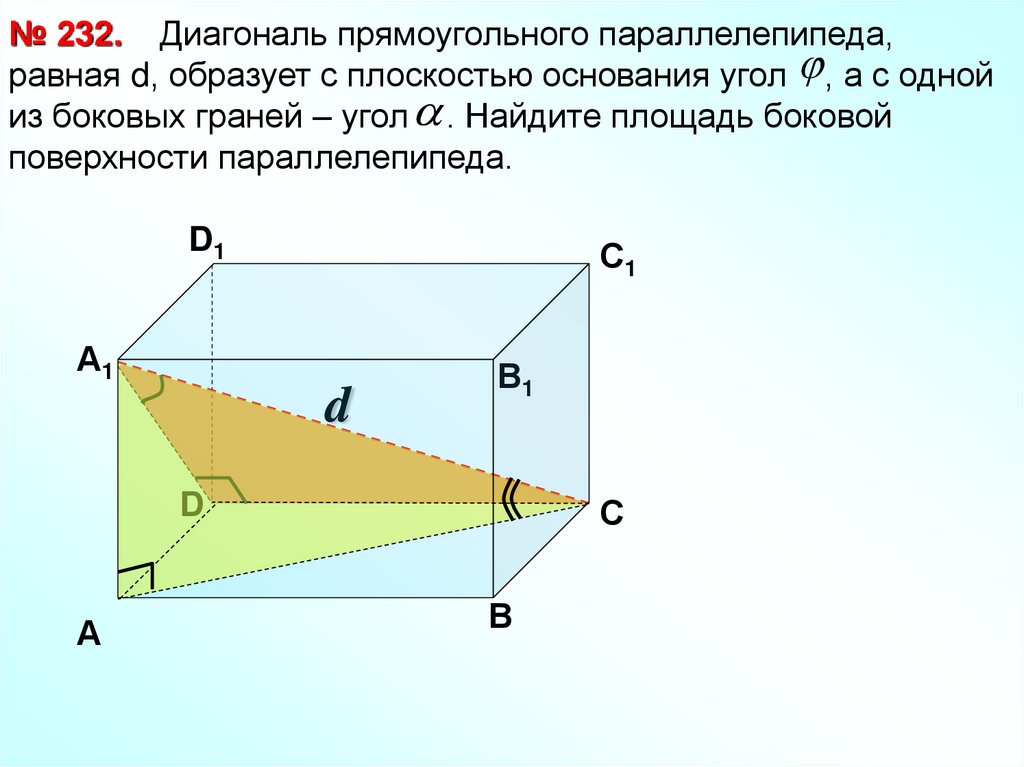 № 232. Диагональ прямоугольного параллелепипеда,равная d, образует с плоскостью основания угол , а с одной