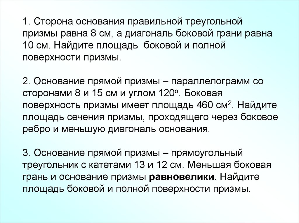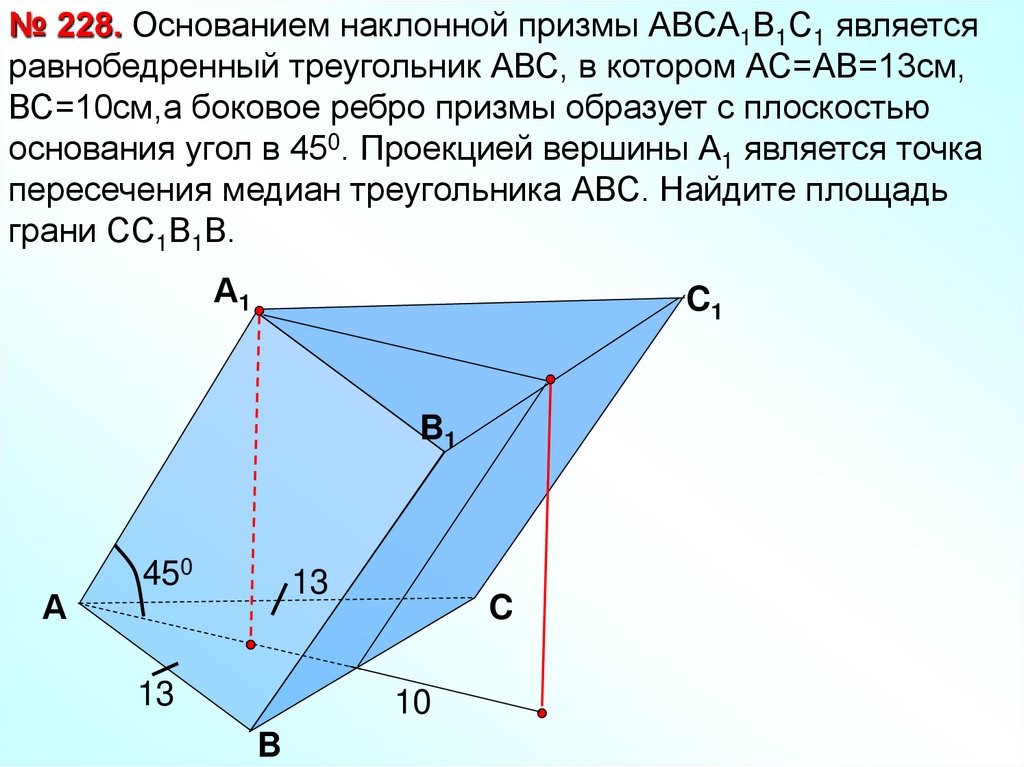 № 228. Основанием наклонной призмы АВСА1В1С1 являетсяравнобедренный треугольник АВС, в котором АС=АВ=13см,