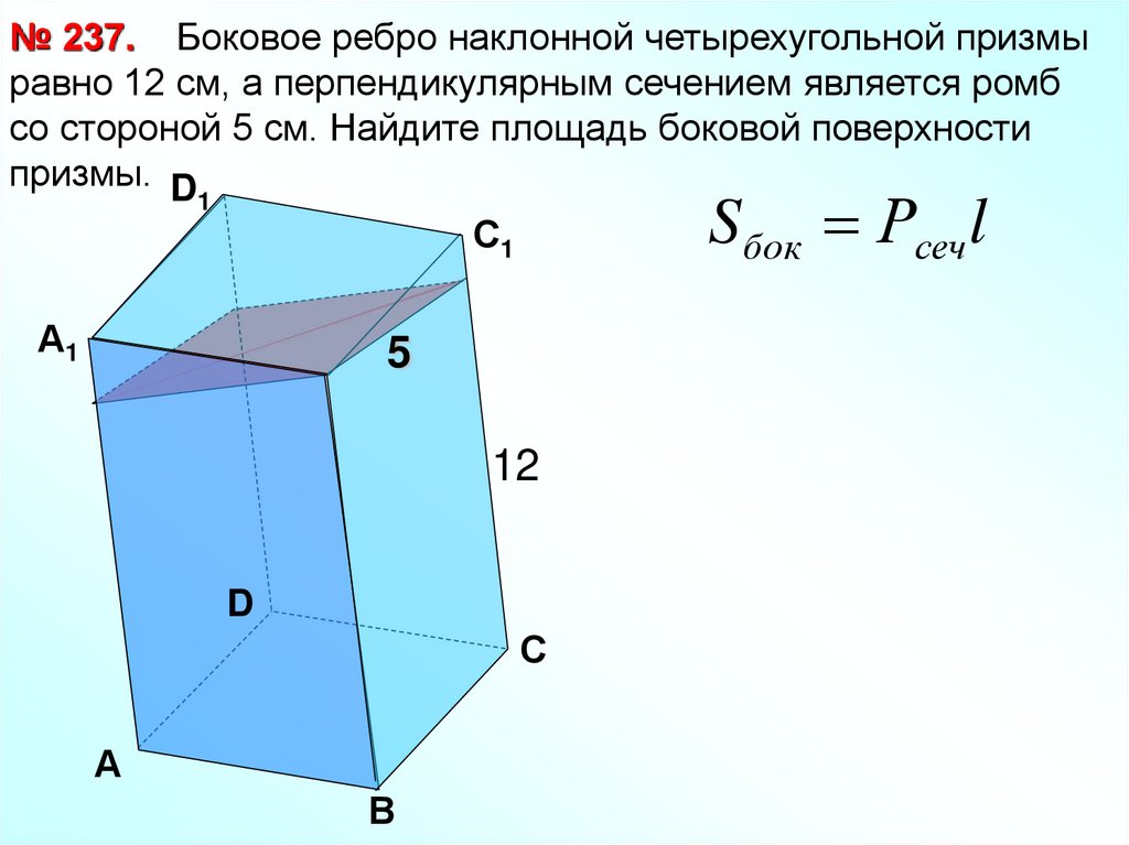 № 237. Боковое ребро наклонной четырехугольной призмыравно 12 см, а перпендикулярным сечением является ромб