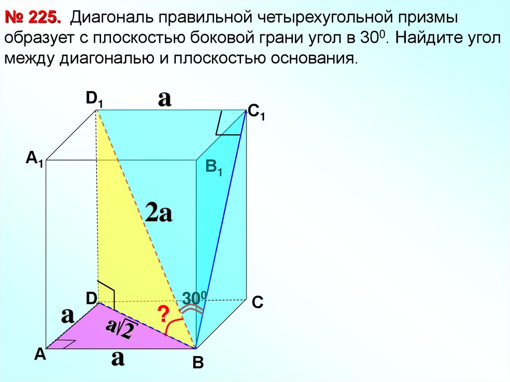 № 225. Диагональ правильной четырехугольной призмыобразует с плоскостью боковой грани угол в 300. Найдите угол