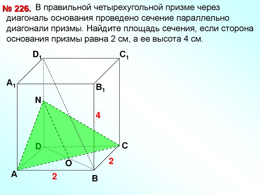№ 226. В правильной четырехугольной призме черездиагональ основания проведено сечение параллельно