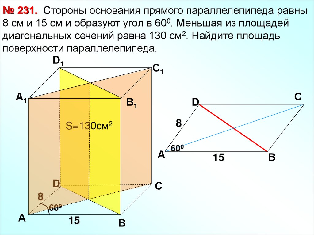 № 231. Стороны основания прямого параллелепипеда равны8 см и 15 см и образуют угол в 600. Меньшая из площадей