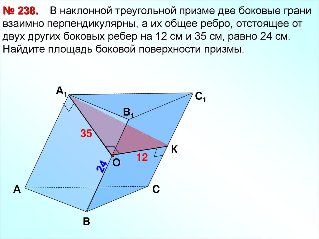 № 238. В наклонной треугольной призме две боковые гранивзаимно перпендикулярны, а их общее ребро, отстоящее от