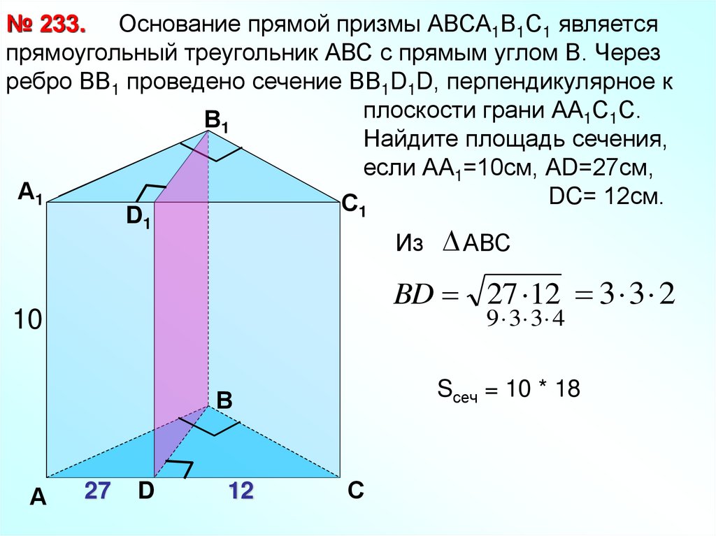 № 233. Основание прямой призмы АВСА1В1С1 являетсяпрямоугольный треугольник АВС с прямым углом В. Через