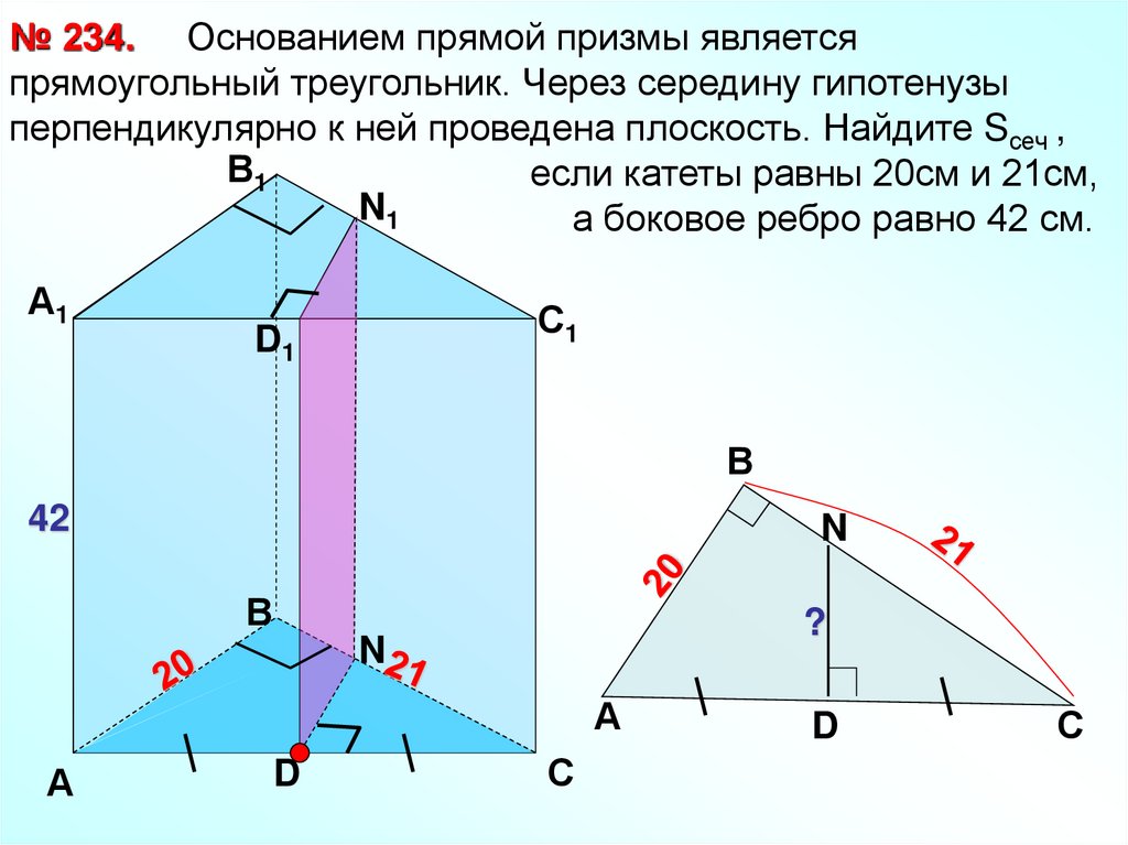 № 234. Основанием прямой призмы являетсяпрямоугольный треугольник. Через середину гипотенузы