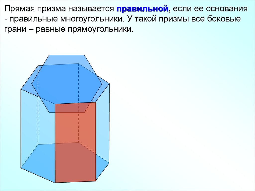 Прямая призма называется правильной, если ее основания- правильные многоугольники. У такой призмы все боковые