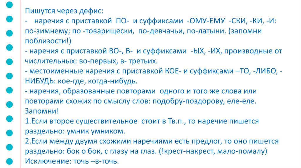 Пишутся через дефис:- наречия с приставкой ПО- и суффиксами -ОМУ-ЕМУ -СКИ, -КИ, -И: