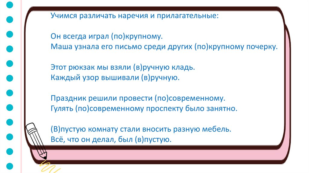 Учимся различать наречия и прилагательные:Он всегда играл (по)крупному.
