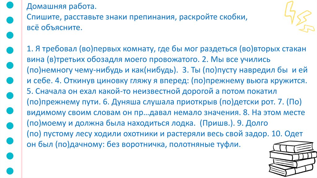 (по)прежнему пути. 6. Дуняша слушала приоткрыв (по)детски рот. 7. (По)
