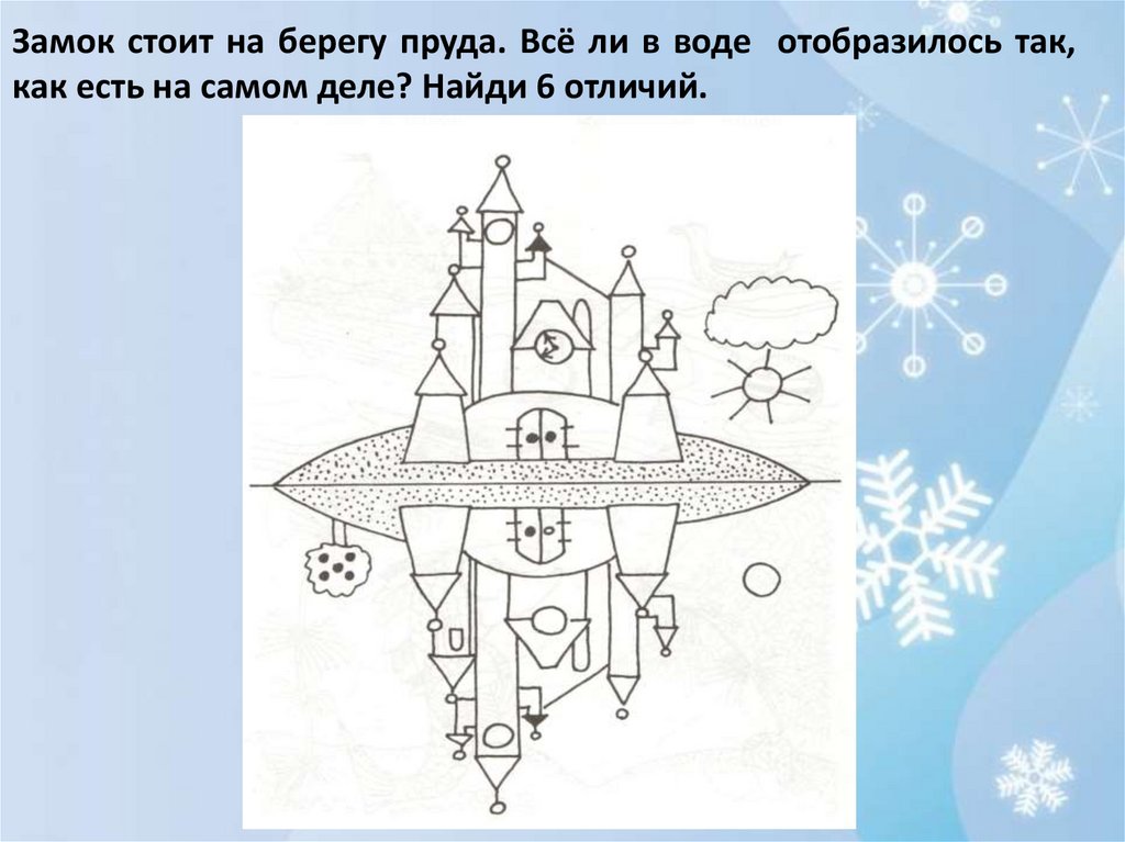 Замок стоит на берегу пруда. Всё ли в воде отобразилось так,как есть на самом деле? Найди 6 отличий.