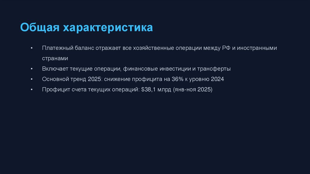 Общая характеристикаПлатежный баланс отражает все хозяйственные операции между РФ и иностранными